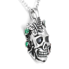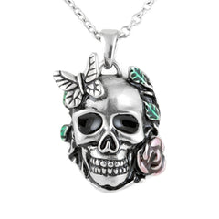 Add a symbol of the beauty of life to your jewelry collection with this beautiful pendant. Made of stainless steel featuring a butterfly and epoxy-colored green leaves and a red flower, this skull is not a token of death but, instead, an emblem of life.