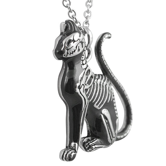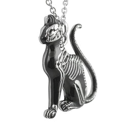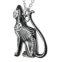 Cat Necklace - Feral Bones - Skeleton Cat. Shrouded in secrecy, the cat has long been a symbol for mysticism. This cat necklace medallion featuring the detailed skeleton of the feral cat is finished with black epoxy and coupled with a stainless steel necklace. It is sure to give the wearer anaura of enchantment and attention-grabbing mystique.