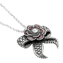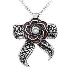 The Rose & Tentacle Bow necklace is a pretty accessory for a pretty lady with a love for aquatic life. Made of stainless steel, the pendant on the Rose & Tentacle Bow necklace has a beautiful rose that is colored with red epoxy and has a white Swarovski crystal which sits in its center. Complete with a stainless steel link necklace, this cute piece is the perfect add-on to any formal or casual outfit.