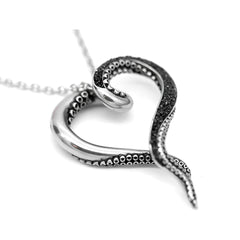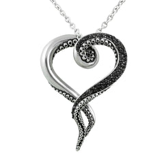 Dark & Bright Tentacle Octopus Necklace - This cool piece features an octopus tentacle intertwining to form a heart. On one half, the tentacle is encrusted with pieces of sparkling, black cubic zirconias, while the other half features our customary clean steel look with black epoxy.