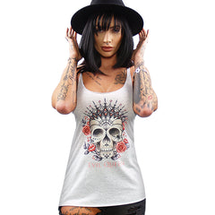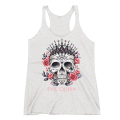 For all the Evil Queens out there. This tank features a deathly looking sugar skull surrounded by roses and adorned with a crown for a menacing look. The exquisite "Evil Queen" compliments the design in a very royal looking font. This racerback tank is soft, lightweight, and form-fitting with a flattering cut and raw edge seams for an edgy touch.